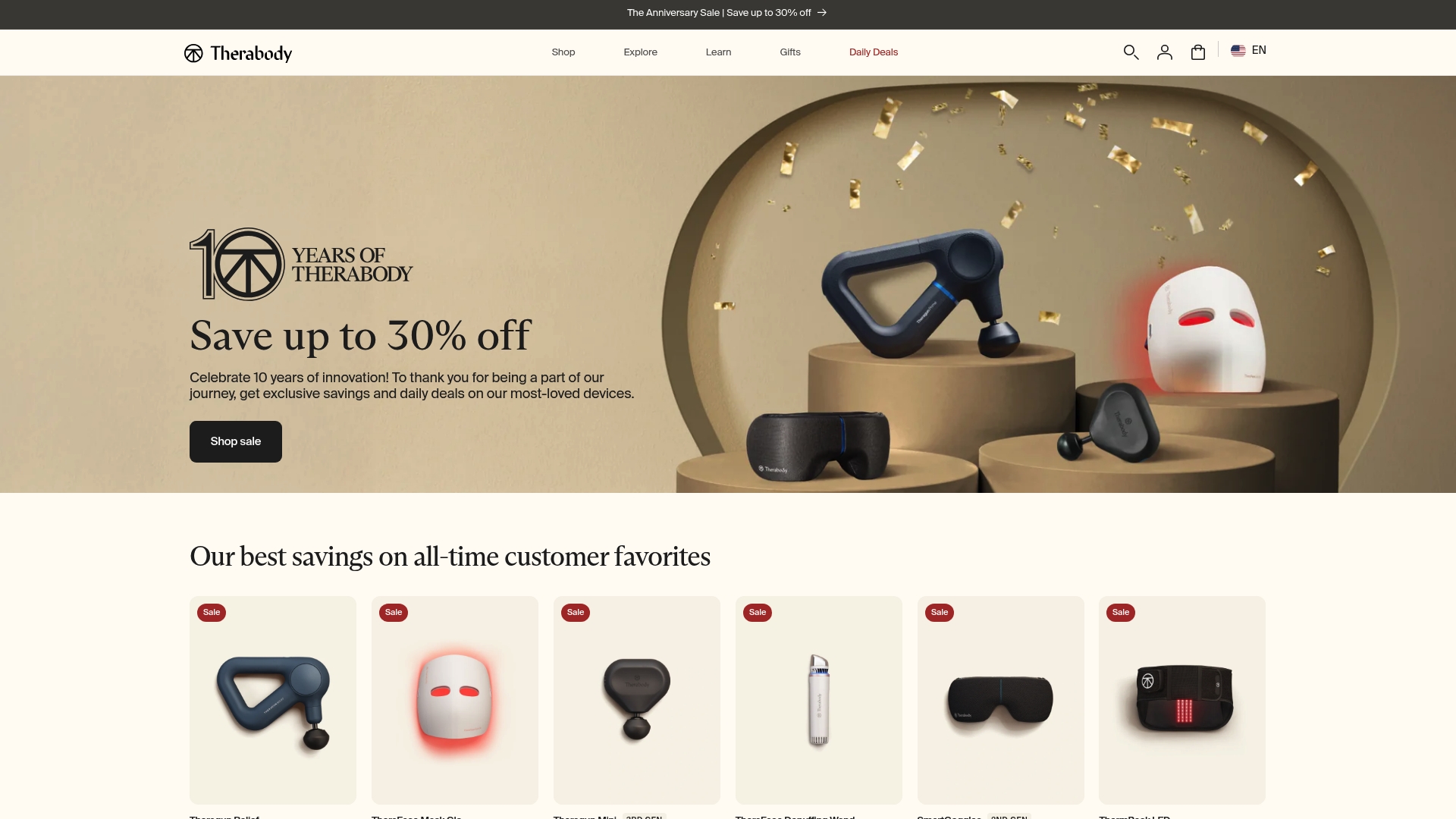 Pricing varies by product and often reflects advanced technology. Examples include the TheraFace Mask Glo listed at $299.99 on sale from $379.99 and the Theragun Prime at $229.99 on sale from $329.99. Many items rotate through sales and bundles.